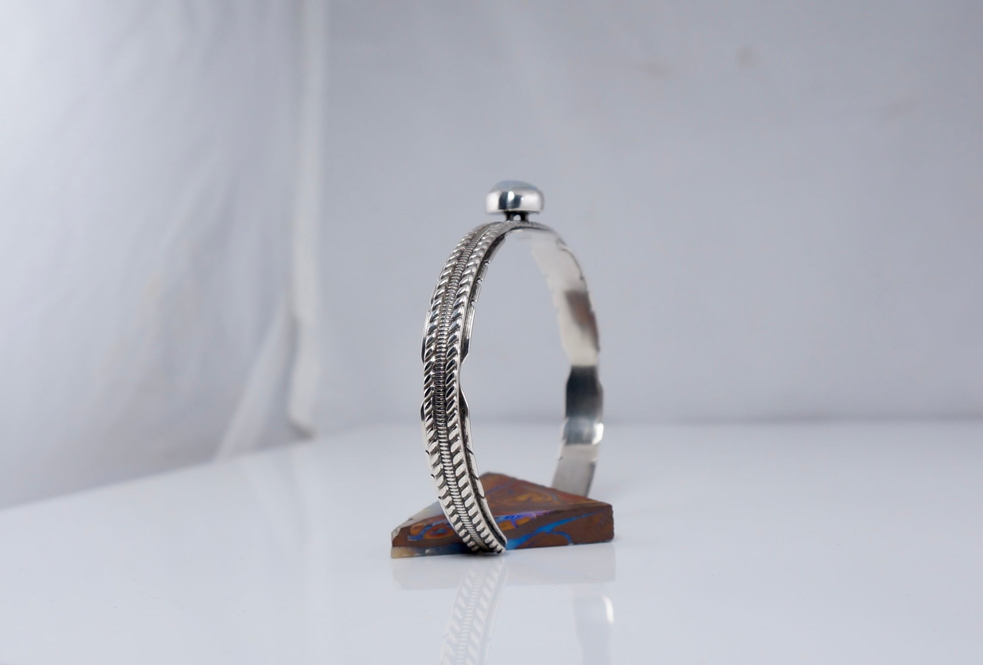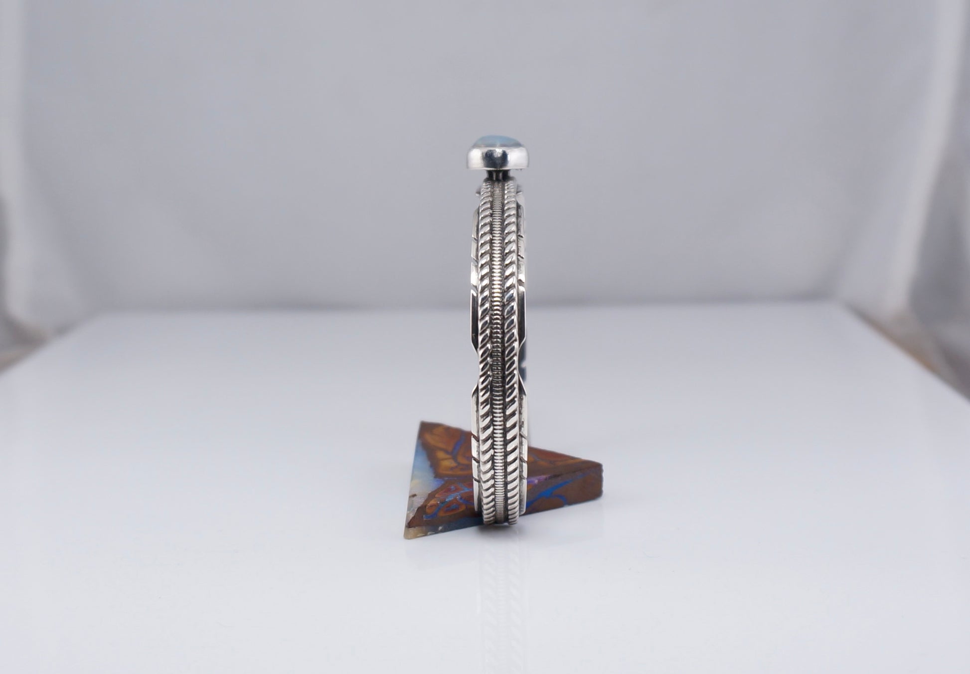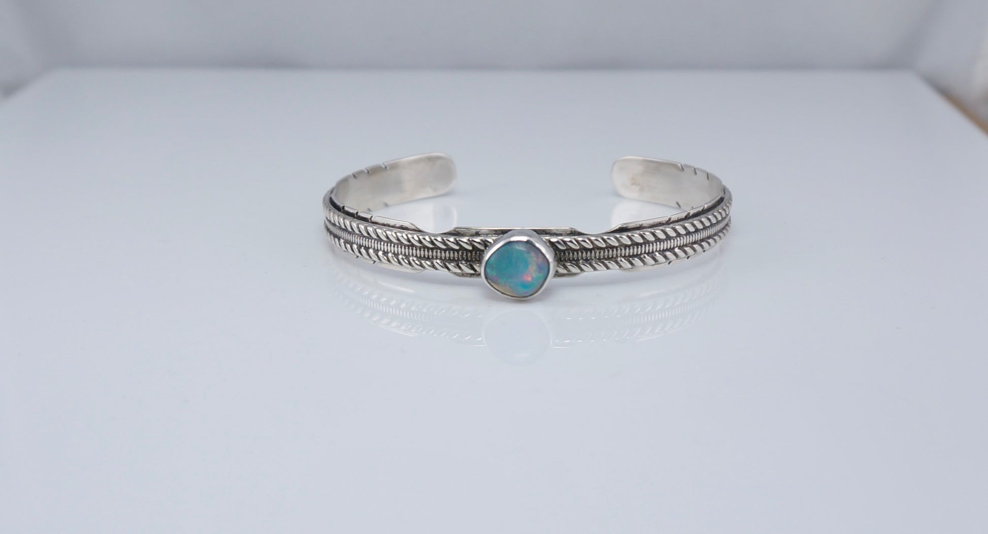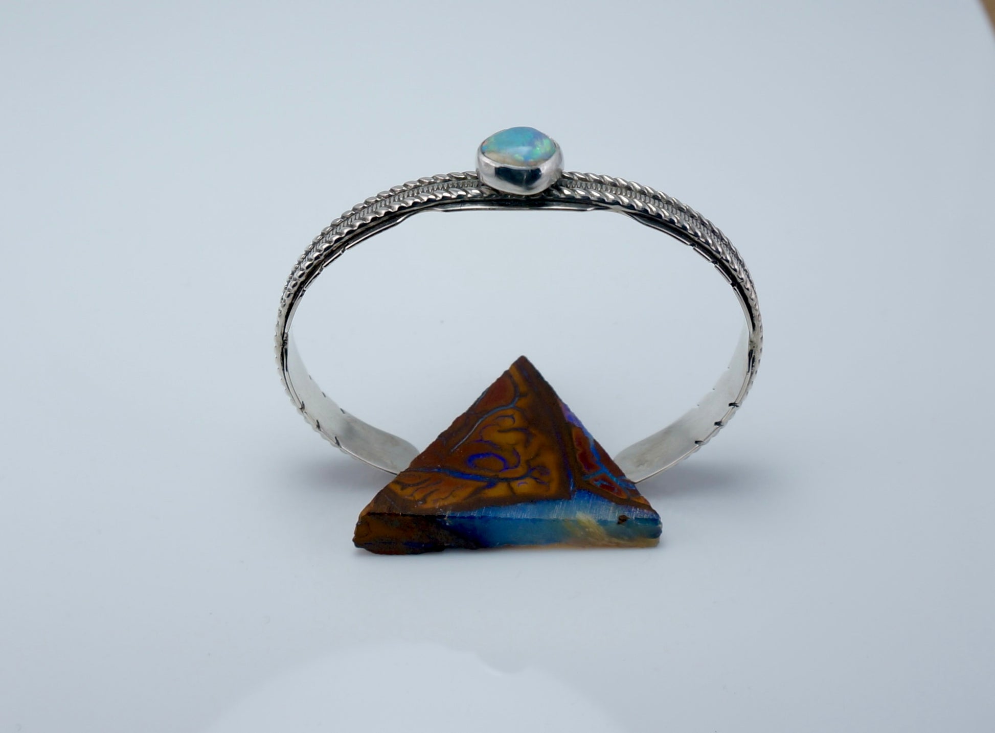 The stone is set in fine silver on a raised bezel, designed to elevate the opal and catch the light from every angle. The cuff itself is forged from patterned sterling silver wire, with custom notching along the outer edge and a soft satin patina that highlights the craftsmanship.