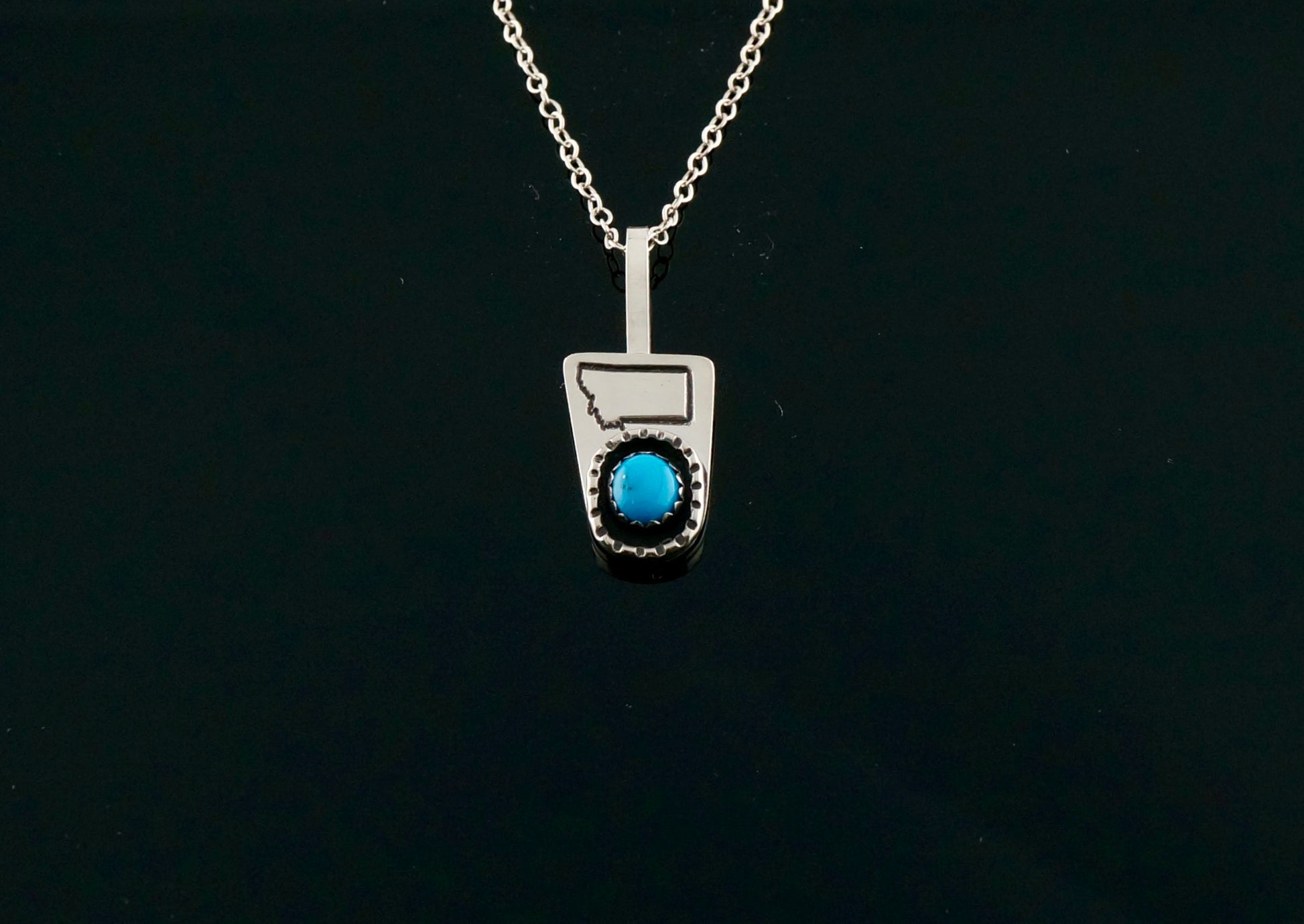 This handcrafted sterling silver pendant necklace features genuine turquoise set in a hand-fabricated bezel, bordered with hand-stamped half-round sterling wire. Dark patina finish.
