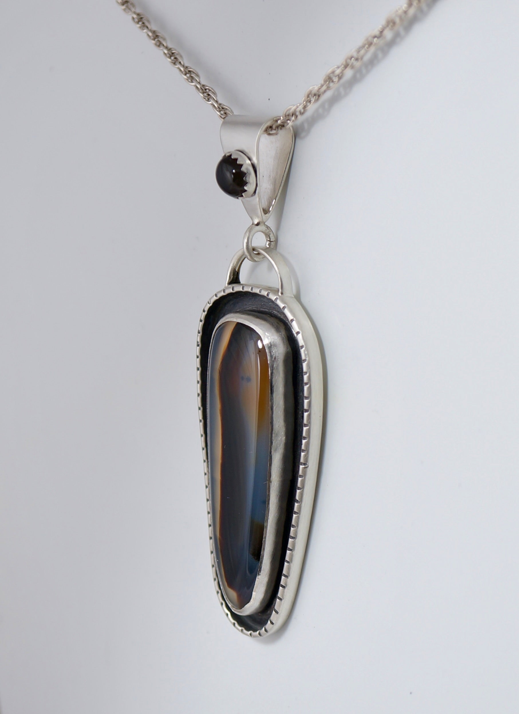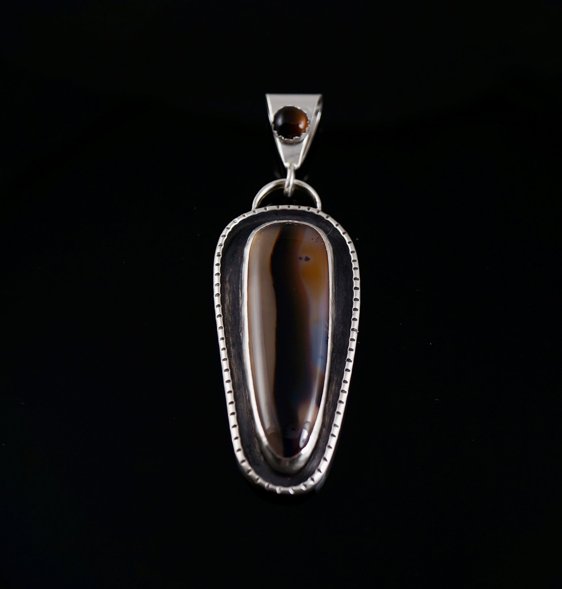 This striking pendant features a stunning Montana Agate (5.2 grams), bezel-set in sterling silver and framed with custom stamped 10g half-round wire. A second Montana Agate accents the hand-crafted bale. A satin finish contrasts with a dark patina border, drawing the eye to the stone’s natural beauty.