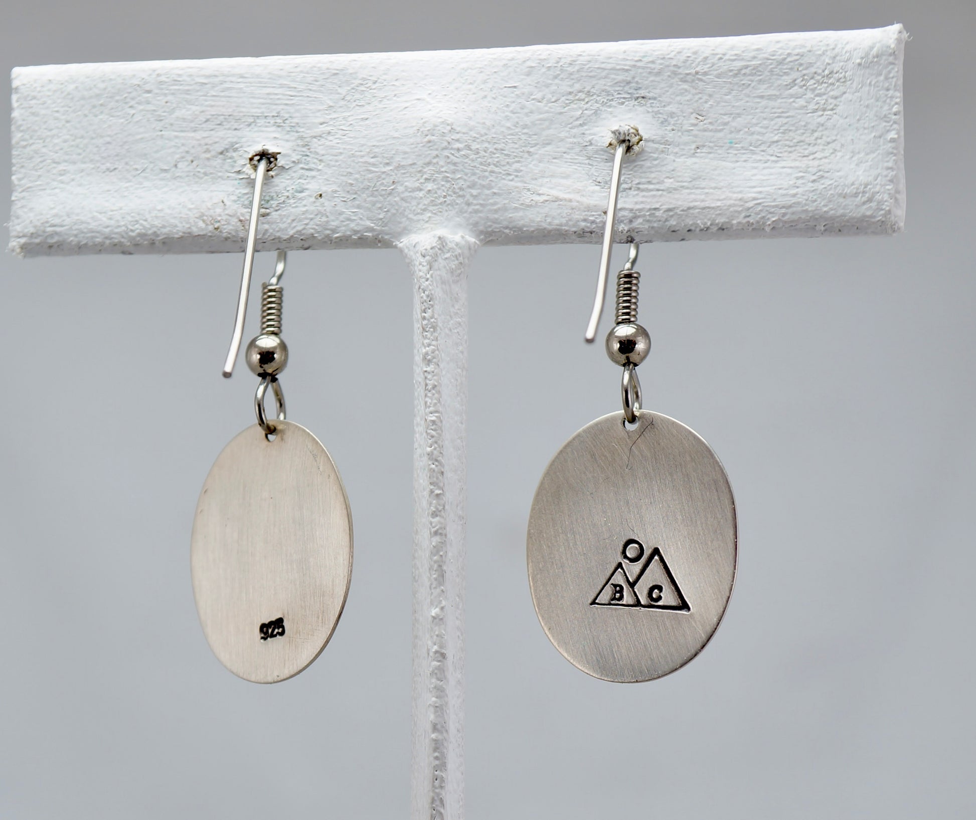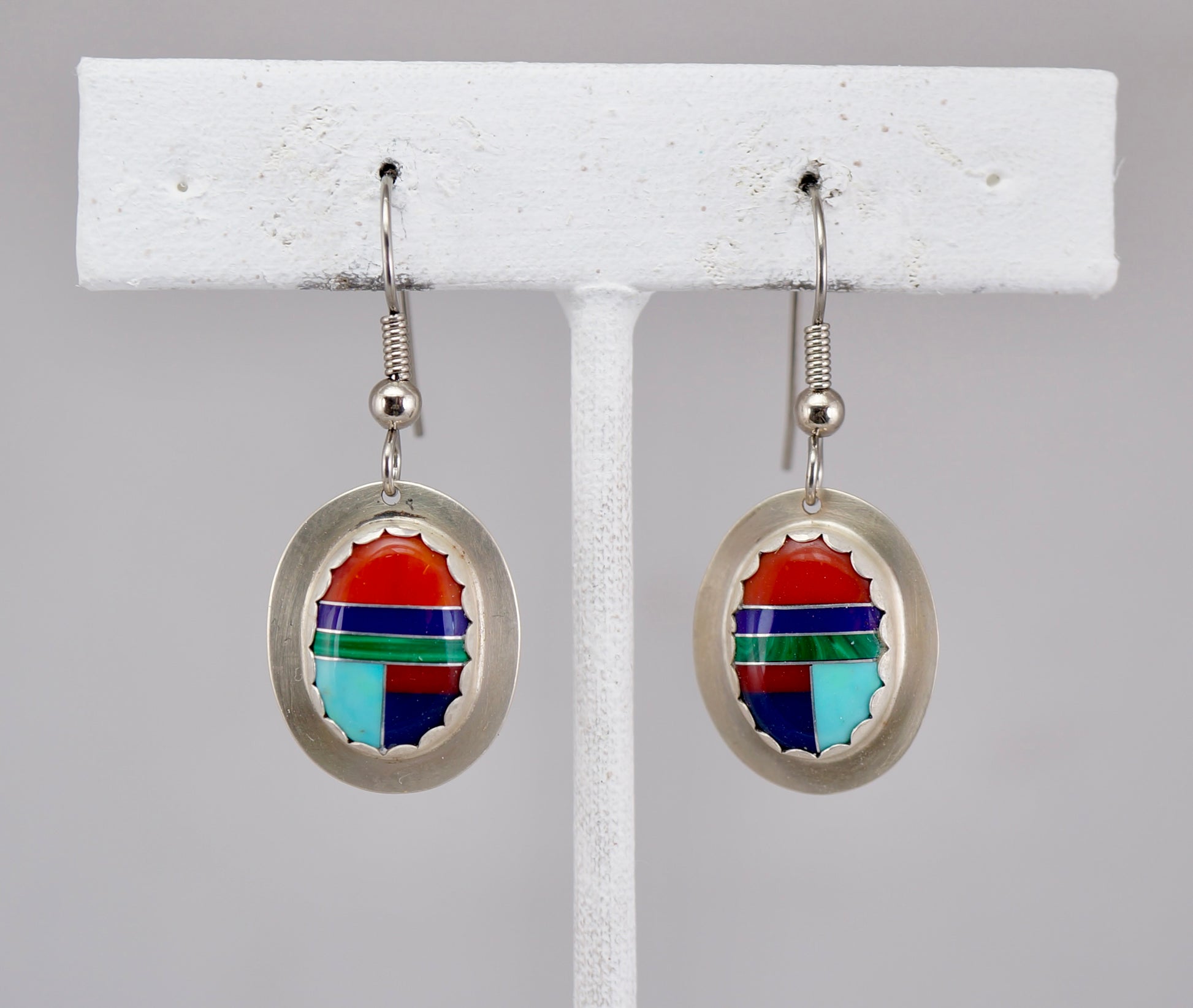 These handcrafted sterling silver earrings feature a stunning channeled inlay of vibrant stones: turquoise, red coral, purple sugilite, lapis lazuli, and malachite. Each stone is carefully cut and set into a satin-finish oval frame, creating a striking geometric pattern full of color and character.