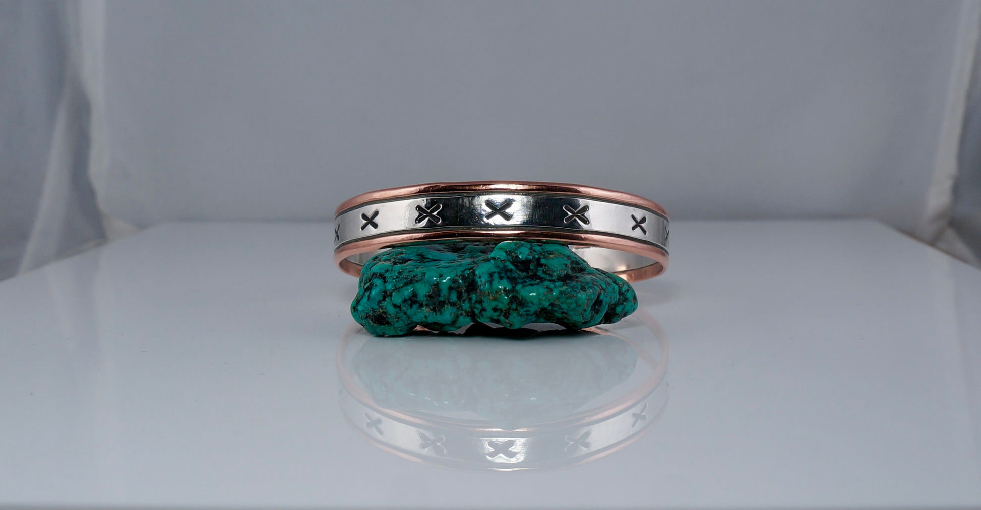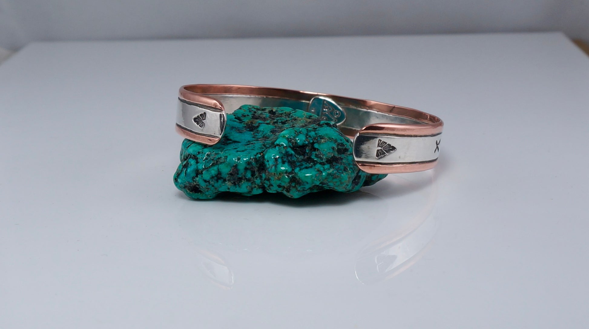 A striking handcrafted cuff featuring sterling silver and copper with hand-stamped detailing, patina depth, and a smooth satin finish.